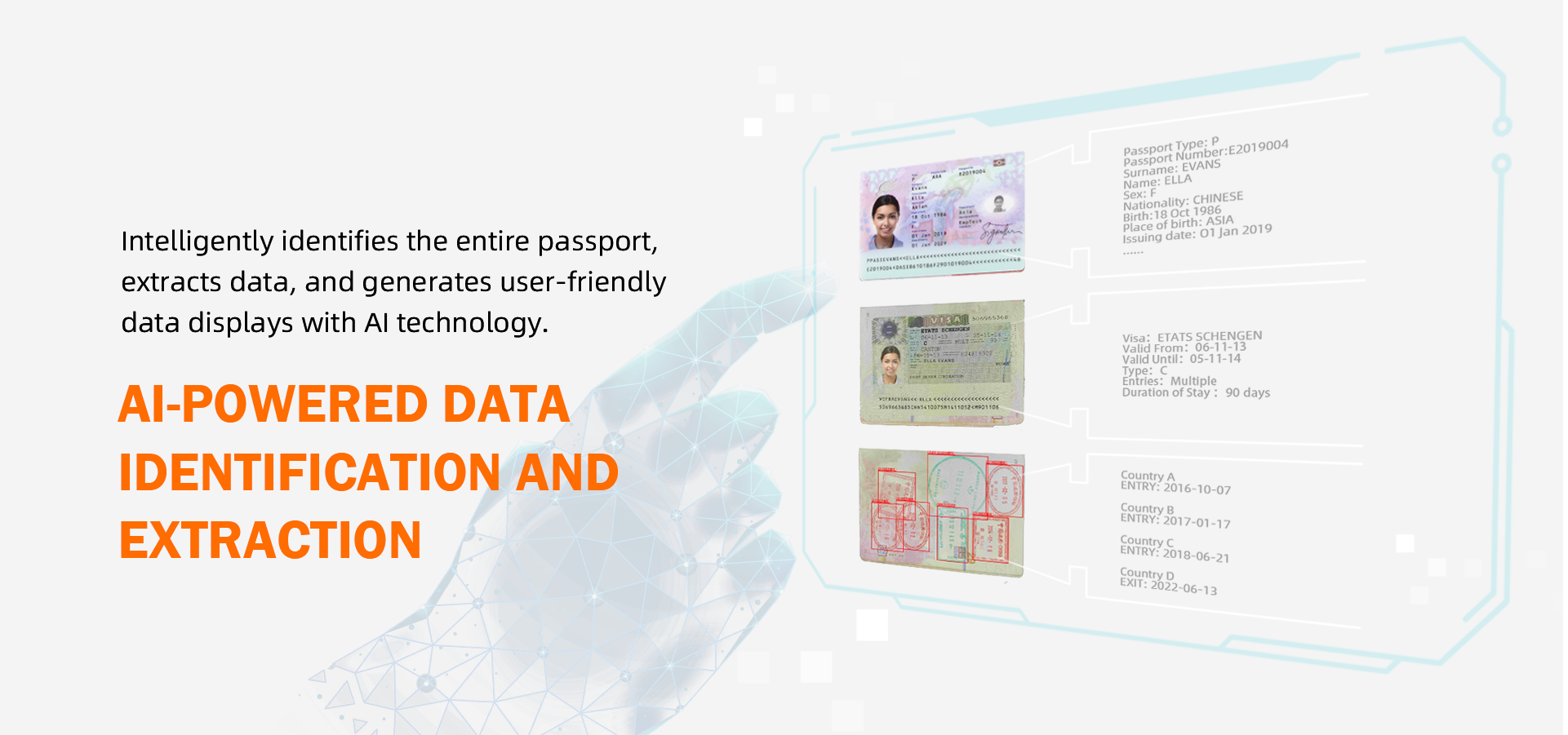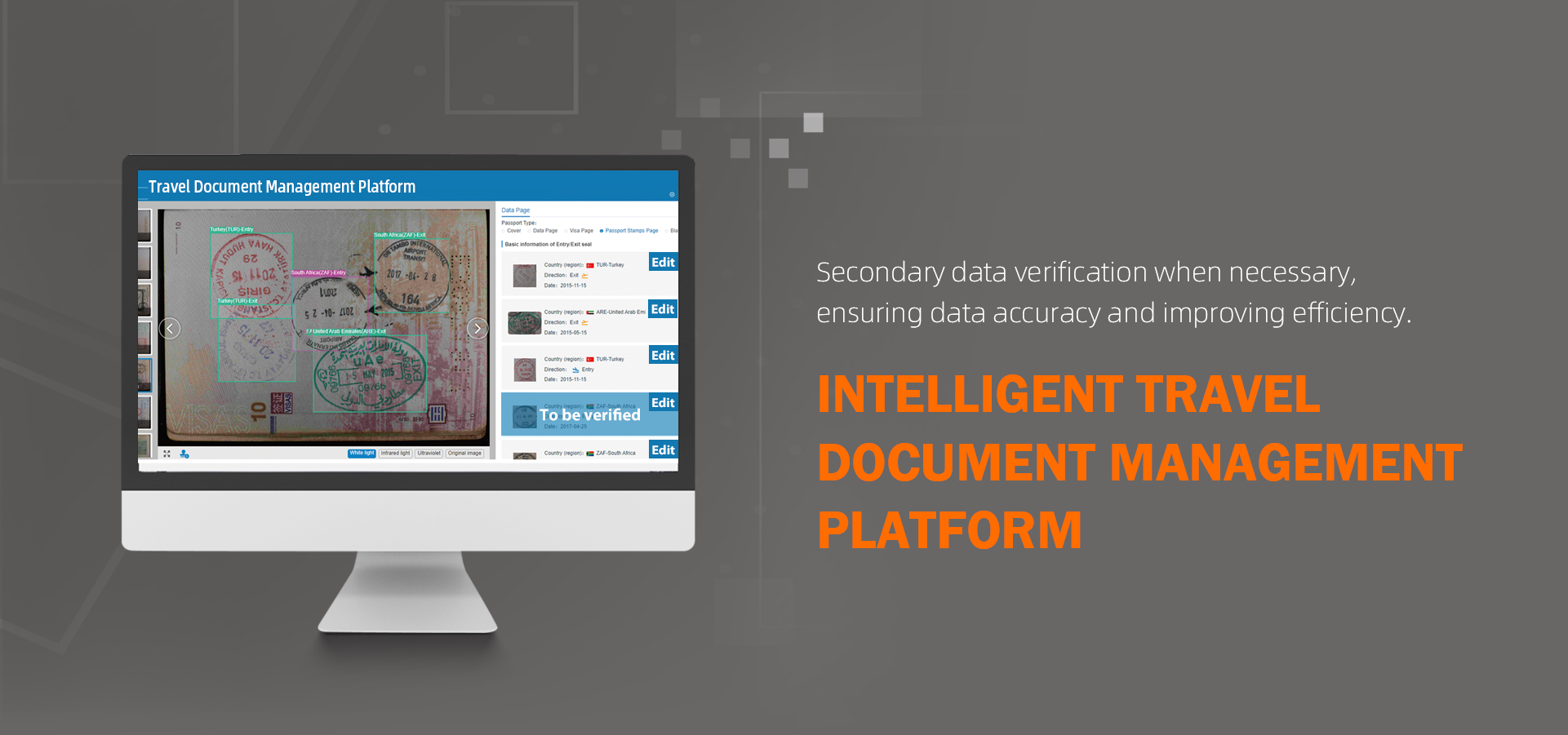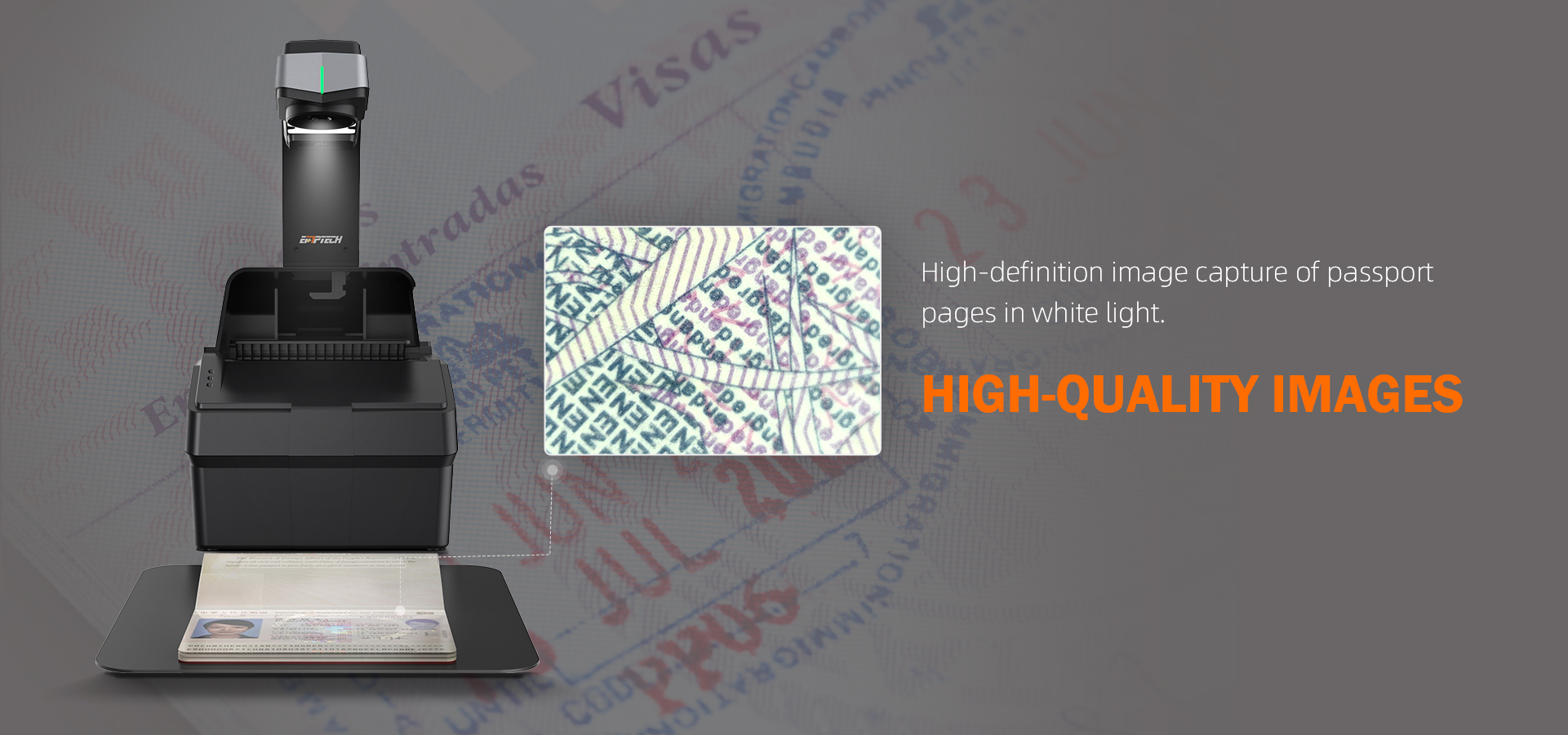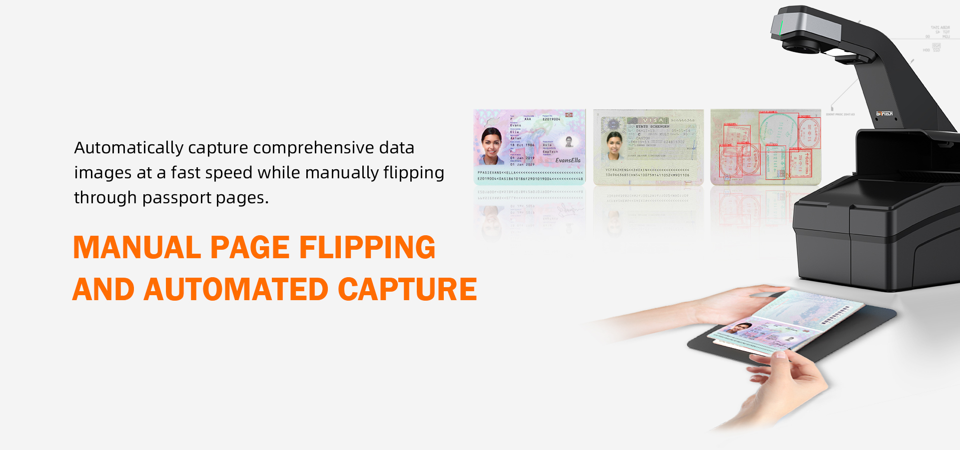 EagleEye Lite is an advanced border management solution designed to improve border security and streamline operations. This compact and versatile device supports automatic image capture while flipping pages manually. Utilizing AI technology, the system intelligently identifies and analyzes data, including information from data page, visa pages, and passport stamps.